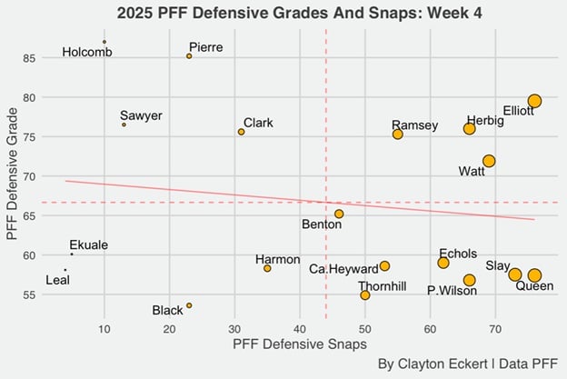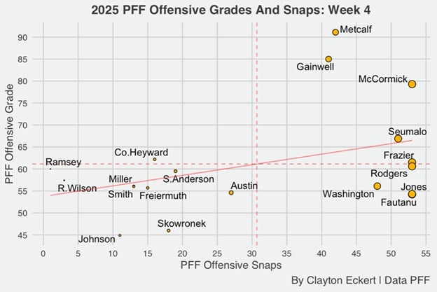The Pittsburgh Steelers are 3-1 heading into the bye week following a 24-21 victory. Unfortunately, it got close at the end, but it was an overall strong performance for much of the game. In this article, I will provide the Steelers’ data from Pro Football Focus (PFF), including grades and takeaways.