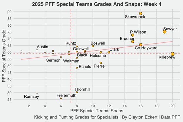 The best special teams grade was Ben Skowronek (88.7, 16). He was awesome, providing three combined tackles. A particularly excellent one was as a gunner on punt coverage, a textbook rep to make the no-gain tackle. All this despite drawing an illegal block in the back. Played on five teams, and was his best special teams game of 2025.